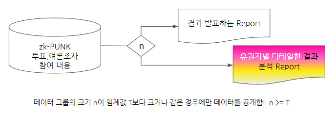zk-PUNK(nft)를 이용한 투표 결과 분석은 개인정보를 적극적으로 보호하면서도, 유의미한 통계 데이터를 얻는 데 도움을 줍니다. 그런데, 적은 수의 유권자 일 때 혹은 과도한 데이터 세분화 문제로 결과 분석 할 때, 익명성을 침해할 수 있기 때문에, 이를 관리하는 것은 필수적입니다.update 2023.6